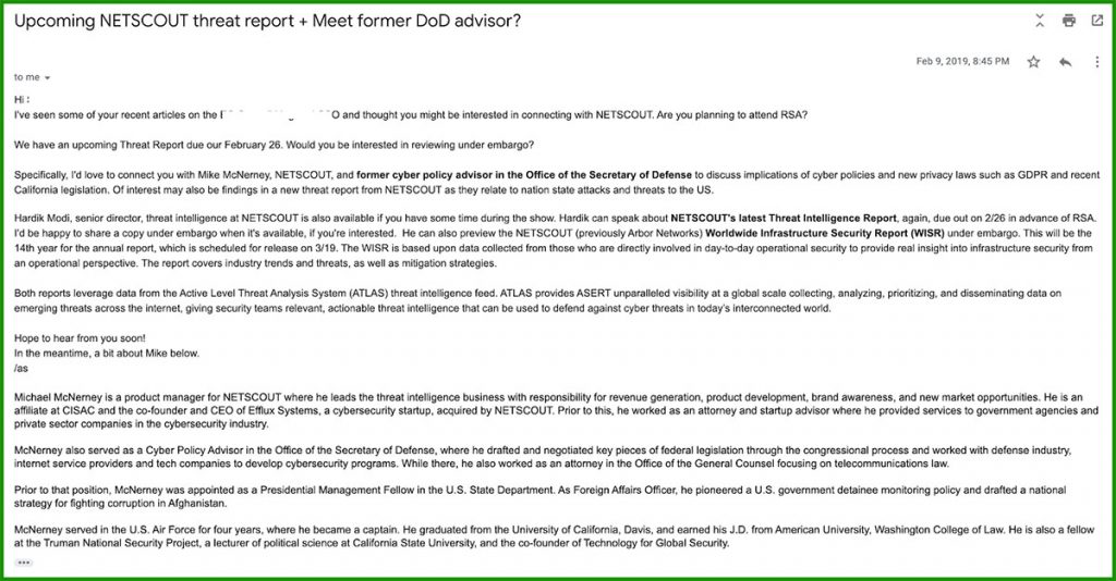 đNow letâs take a look at a B2B PR done well. Here is an email sent from a PR firm on behalf of their client, NETSCOUT:
